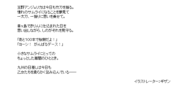 星四護符ー追加 青い目のサムライ悪魔的ひきこもり装置努力は欠かさずわたしの宇宙服B.L.A.C.K. Valentine新たな友と嘘か真か 「青い目のサムライ」 どこかをクリックするとウィンドウが閉じます 「サムライアンジュの九州武者修行」イベントドロップアップ護符 「悪魔的ひきこもり装置」 どこかをクリックするとウィンドウが閉じます 謹賀新年ログインキャンペーン 「努力は欠かさず」 どこかをクリックするとウィンドウが閉じます 「四国乙女 期間限定ピックアップ調査」追加護符 「わたしの宇宙服」 どこかをクリックするとウィンドウが閉じます 「宙の乙女と星の海」イベントドロップアップ護符 「B.L.A.C.K. Valentine」 どこかをクリックするとウィンドウが閉じます 「クリティカルバレンタイン 乙女たちのレシピ」イベント護符 「新たな友と」 どこかをクリックするとウィンドウが閉じます 「桜花爛漫! 天神花見十番勝負」イベント護符 「嘘か真か」 どこかをクリックするとウィンドウが閉じます 「那智みうめピックアップ調査」追加護符